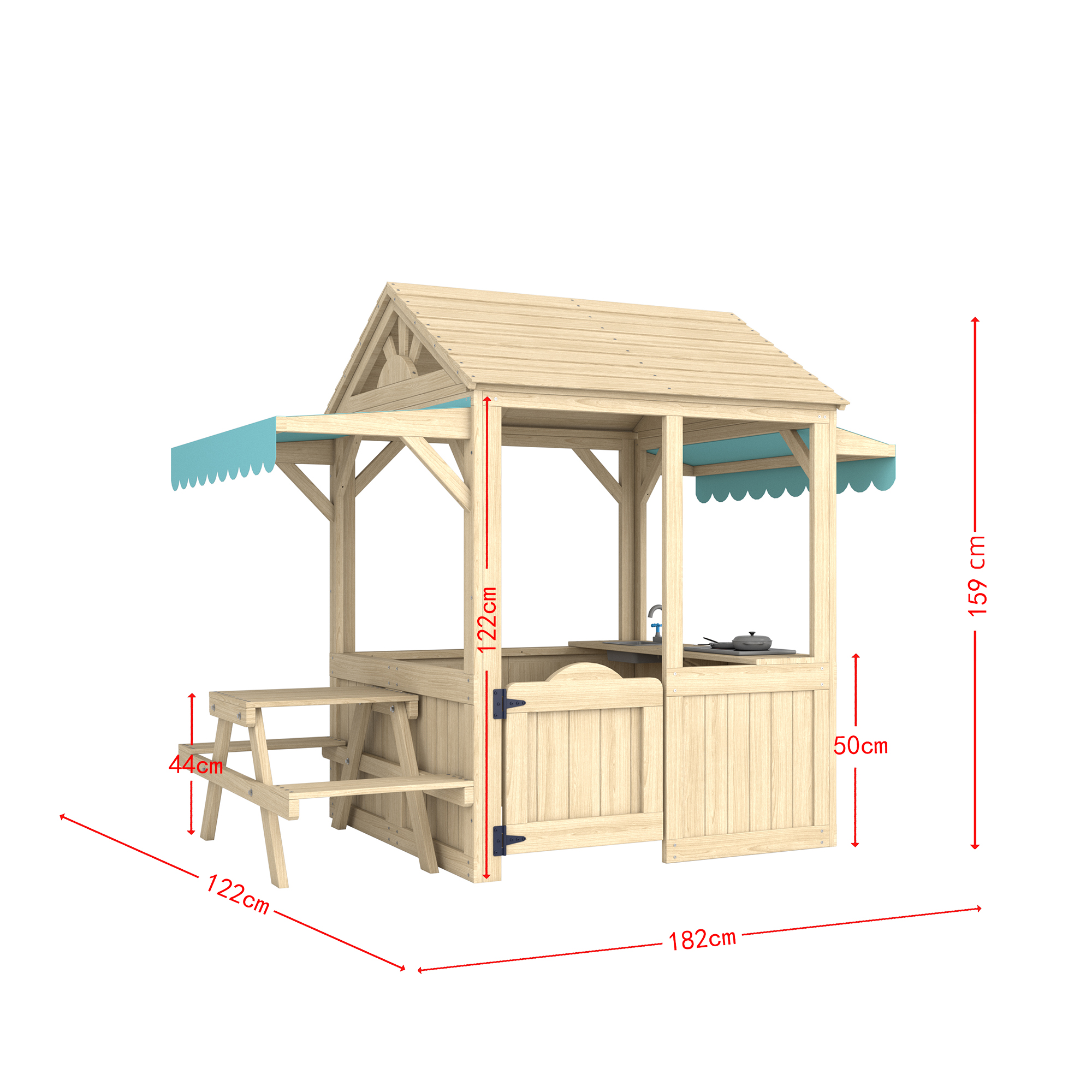 वाइडवेद्वारे या मुलांचे लाकडी प्लेहाउस प्रीमियम फर लाकडापासून तयार केले गेले आहे, जे इको-फ्रेंडिटी, सामर्थ्य आणि टिकाऊपणा सुनिश्चित करते. 182 × 122 × 159 सेमी मोजण्याचे, संरचना सुरक्षिततेची हमी देताना कल्पनारम्य खेळासाठी पुरेशी जागा प्रदान करते. प्लेहाउसमध्ये एक लहान सिंकसह वर्कबेंच आहे, साइड टेबल आणि बेंचसह, भूमिका-खेळण्यासाठी आणि गट क्रियाकलापांसाठी योग्य. रंगीबेरंगी फॅब्रिक शेड्ससह पिच केलेले छप्पर मोहक आणि कार्यक्षमता दोन्ही जोडते, ज्यामुळे ते मैदानी वापरासाठी योग्य बनते. प्रत्येक तपशील काळजीपूर्वक गुळगुळीत काठासाठी पॉलिश केला जातो, खेळादरम्यान मुलांचे संरक्षण करतो. अंगण किंवा बालवाडीसाठी आदर्श, हे प्लेहाऊस एक मजेदार आणि सुरक्षित वातावरण तयार करते. मैदानी मुलांच्या उत्पादनांमध्ये अनेक वर्षांच्या कौशल्यासह, वाइडवे जगभरातील ग्राहकांद्वारे विश्वासार्ह गुणवत्तेवर विश्वास ठेवते.